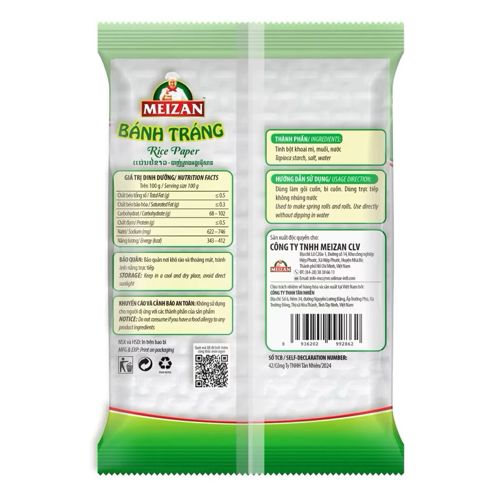 Bánh tráng Meizan với thành phần chính từ bột tinh bột sắn, bánh tráng Meizan siêu mỏng giúp bánh cuốn thơm ngon, dai mà không cần nhúng nước. Vô cùng tiện lợi và tốt cho sức khỏe của cả gia đình!